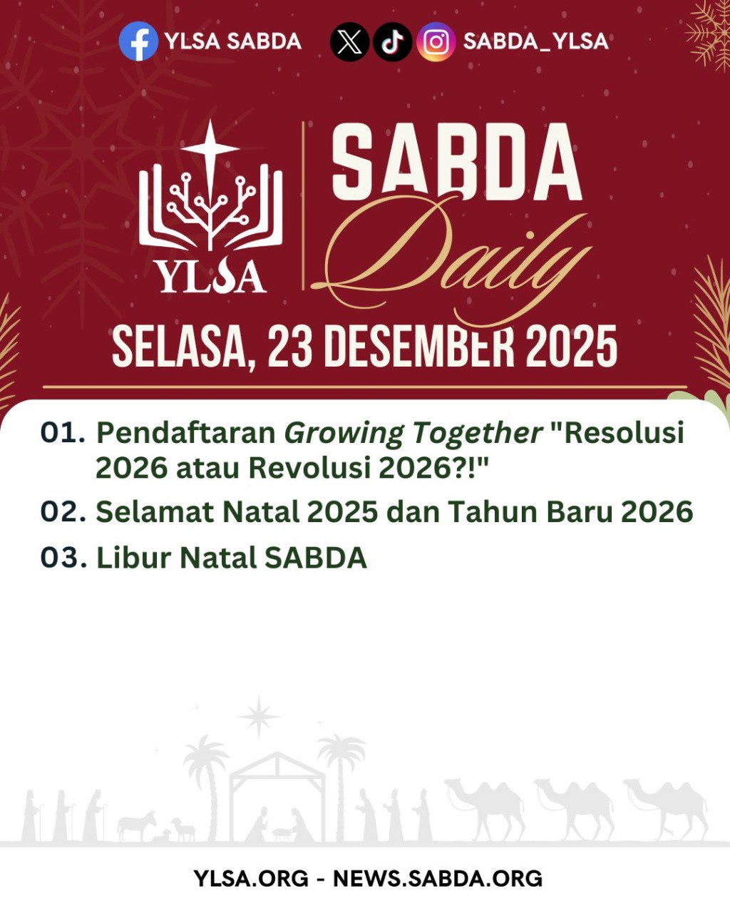 Hore! Kalender Kegiatan YLSA Januari 2026 sudah bisa Sahabat SABDA dapatkan hari ini di situs SABDA.Info (sabda.info/kalender). Jangan lupa ikuti acaranya ya! Boleh diinfokan kepada rekan-rekan yang lainnya juga.